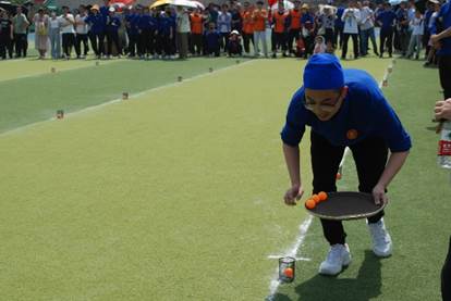 参赛教职工手持装有10个球的托盘起跑,依次将球放进沿途设置的10个笔筒中,跑至对面后再返回依次将球捡起并放回托盘中,接力进行直至所有人完赛,途中你追我赶、妙趣横生。