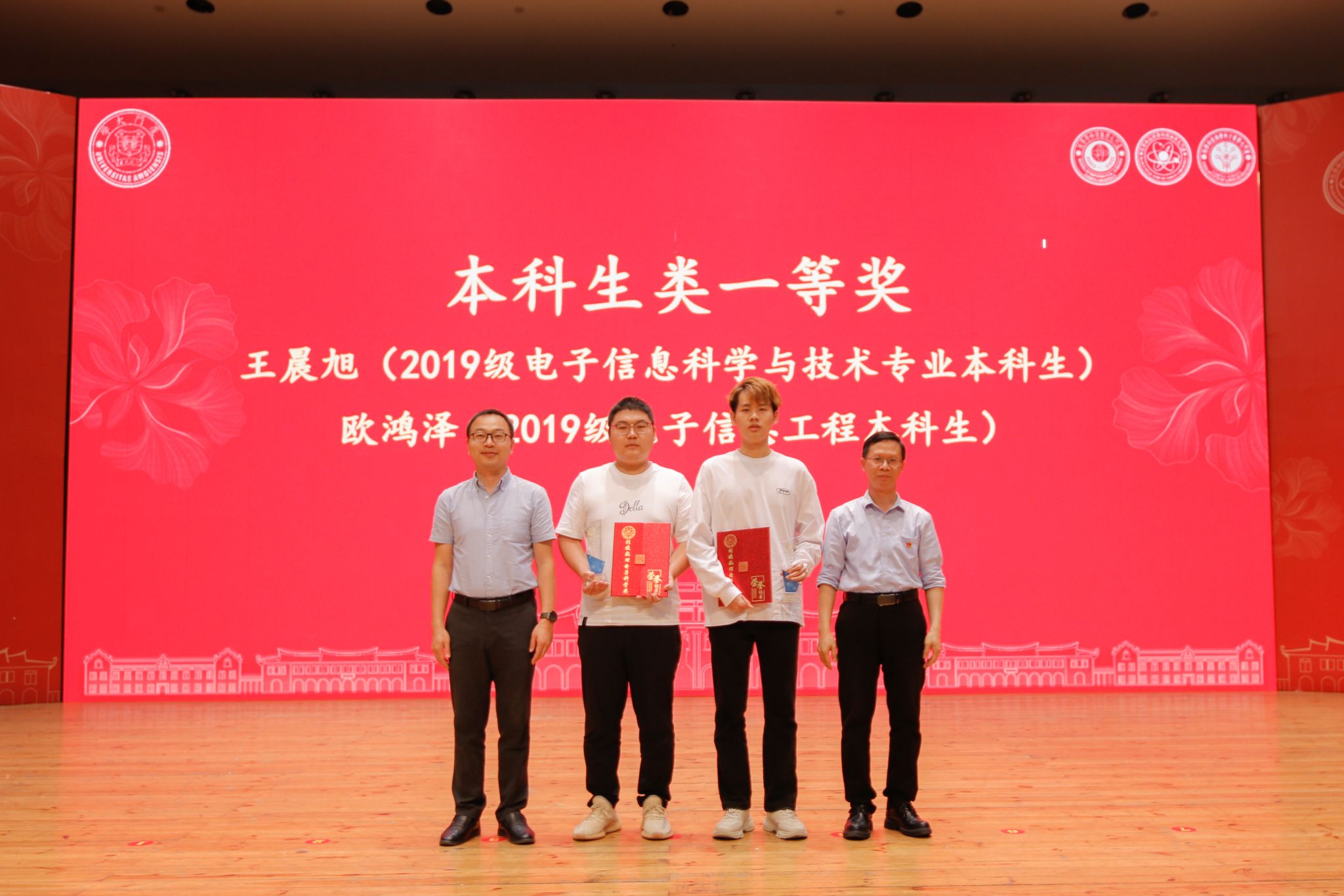 郑辉、方银水为获得刘晓数理电子科学本科生类一等奖颁奖
