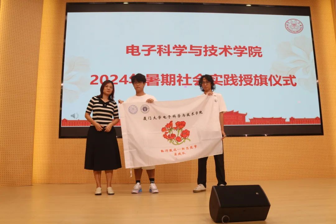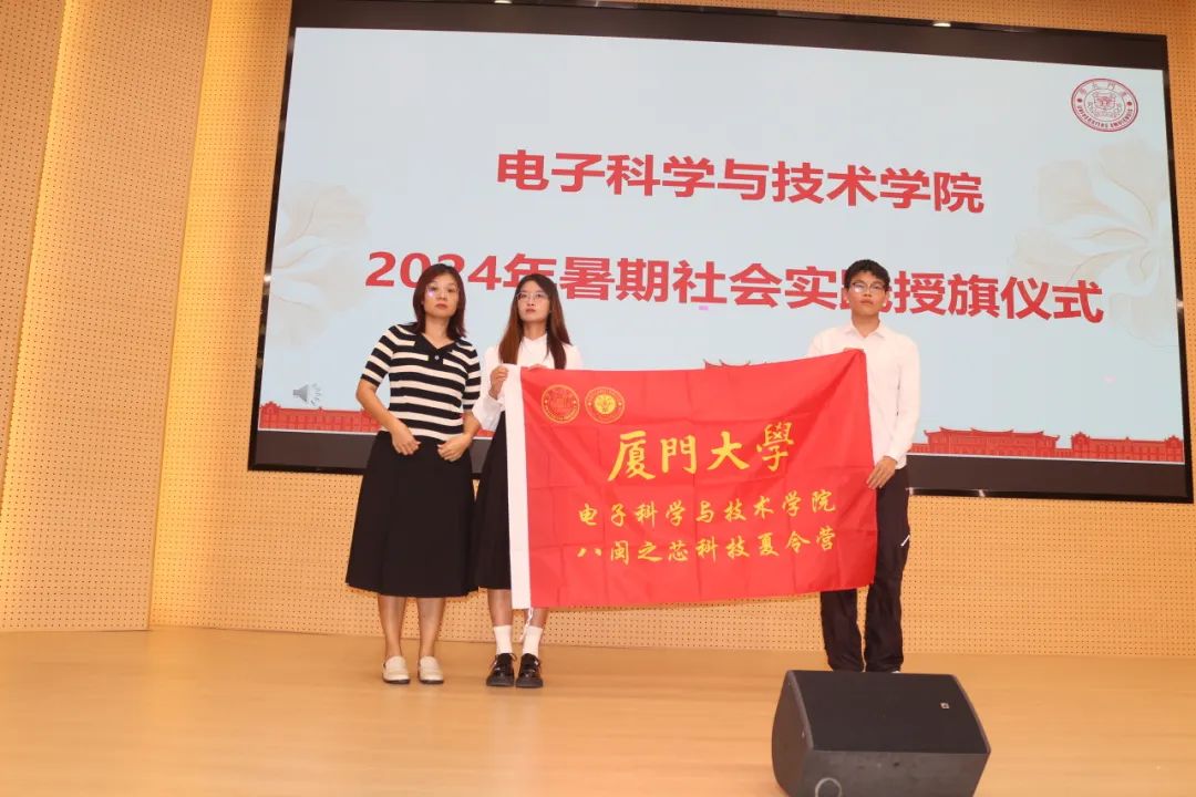 林蕊为实践队代表授旗,激励芯青年们积极投身暑期“三下乡”社会实践活动,以此为契机扩展视野,用实际行动展现青年担当。