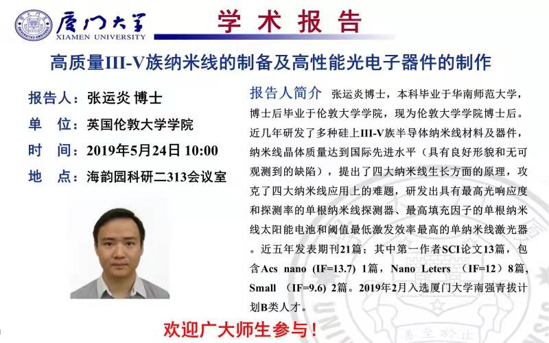 【学院讲座】高质量III-V族纳米线的制备及高性能光电子器件的制作