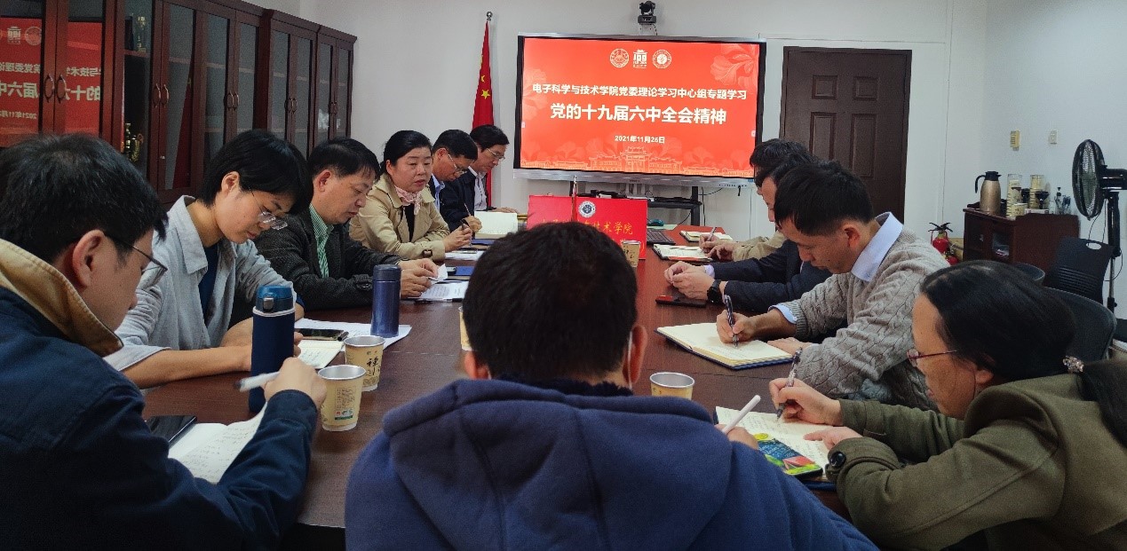 11月25日上午,学院党委理论学习中心组在思明校区海韵园科研二214专题学习贯彻了党的十九届六中全会精神。会议由学院党委书记吴国瑛主持,院长陈忠,副院长张保平、蔡励元,党委副书记方银水、郑莉及5位教工支部书记参加本次学习活动。