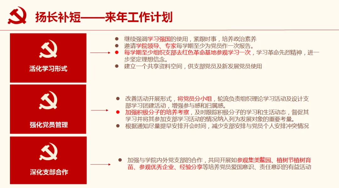一年来,支部围绕“五动青春建支部,七心合力铸红魂”为中心,着力培养支部党员的爱国心、恒心、信心、上进心、务实心,取得良好的成果。但党支部的工作开展中也存在三大问题:联系性不足、多样性不足、共享性不足。针对以上问题,支部未来的工作开展将注意活化学习形式、强化党员管理、深化支部合作。